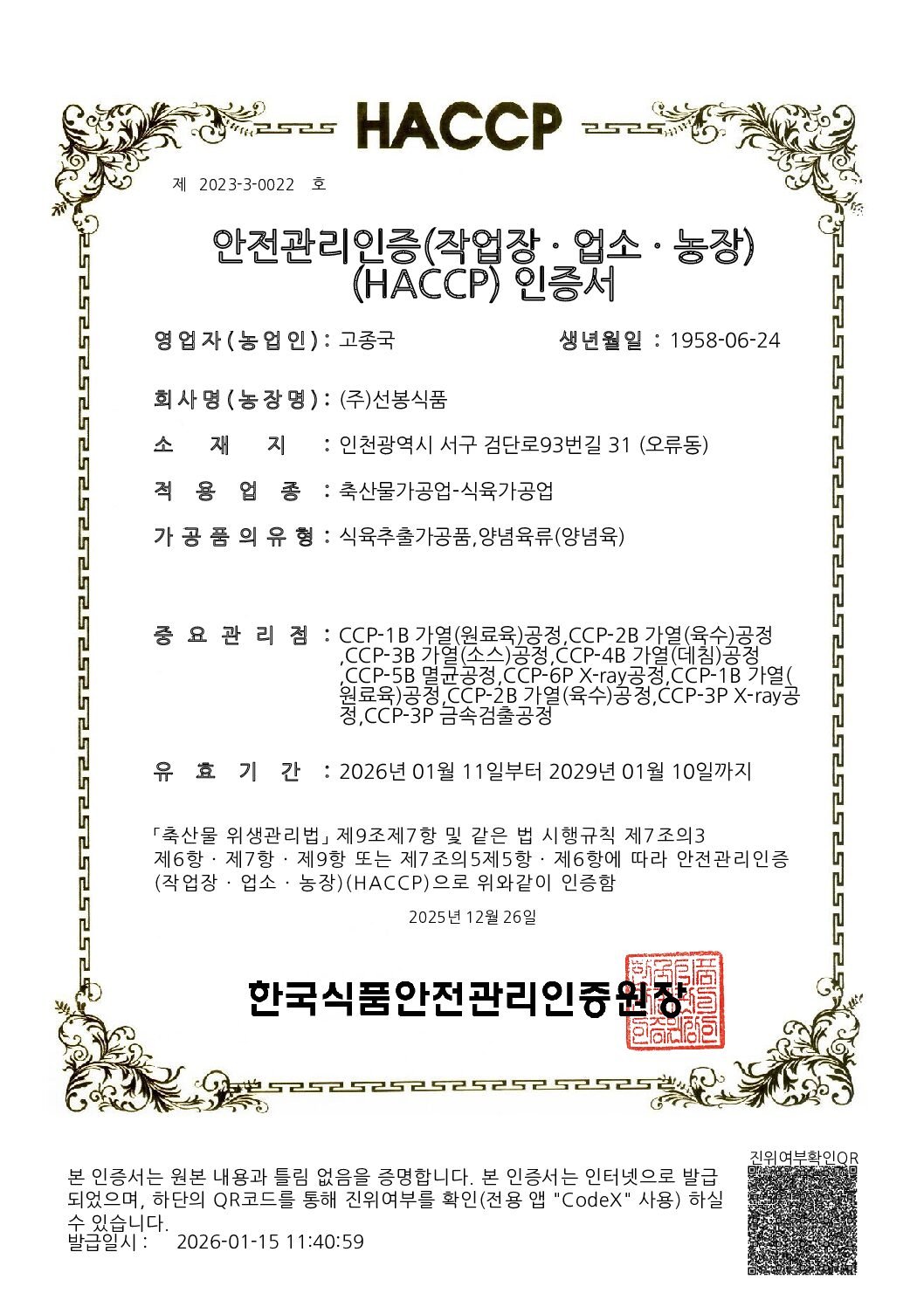 모든 과정에서 식품 안전을 최우선으로 관리합니다. 선봉식품은 기준을 낮추지 않습니다.