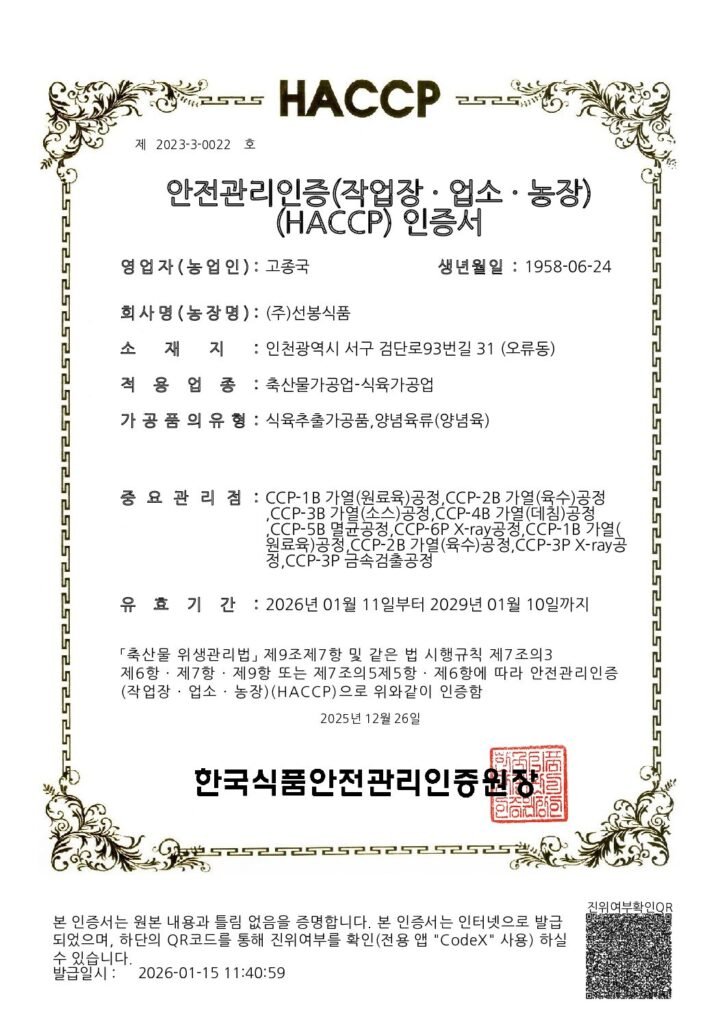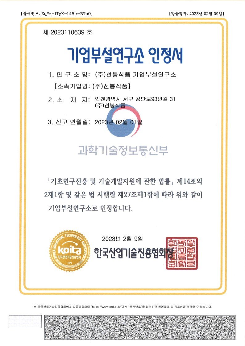 각종 인증과 특허는 안전한 원료, 정직한 공정, 그리고 품질에 대한 선봉식품의 책임 있는 약속입니다.