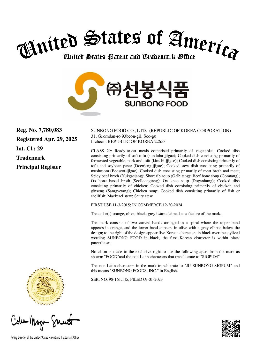 미국상표등록증(선봉식품)