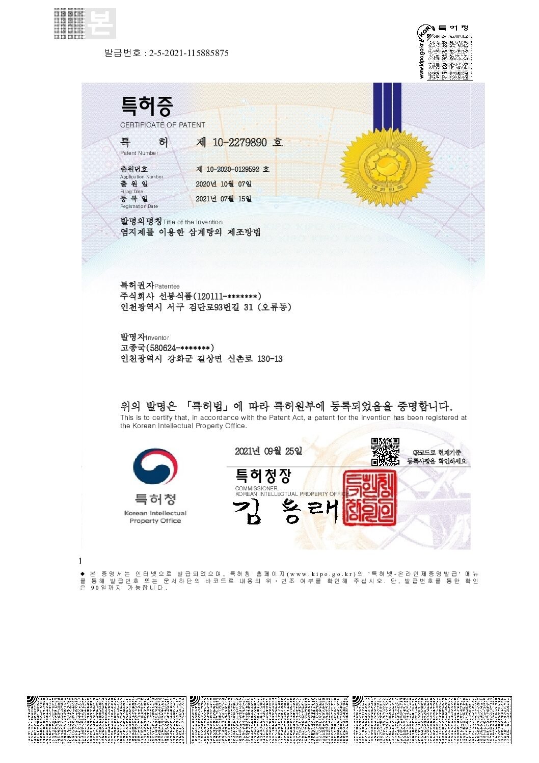 특허증(염지제를 이용한 삼계탕의 제조방법)