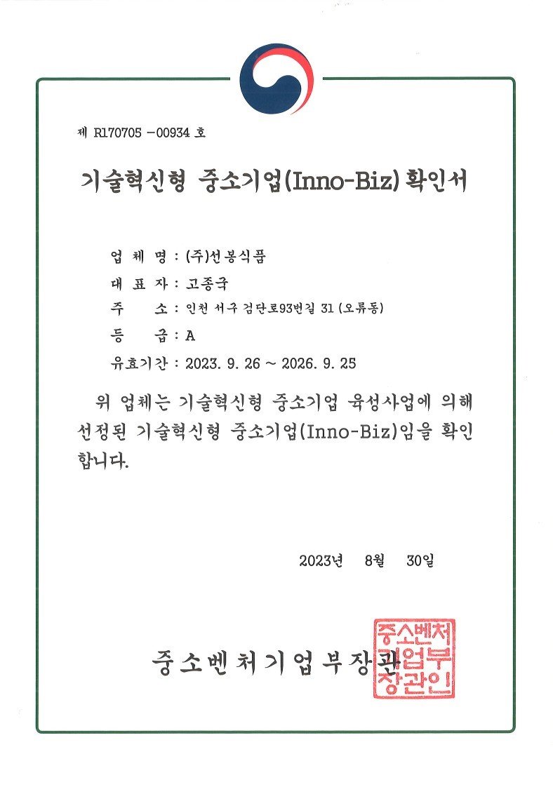 선봉식품 기술인증